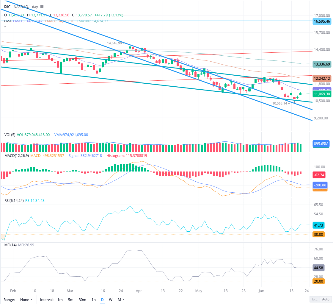 나스닥은 현재 위에 그어 놓은 채널에서 움직이고 있습니다. 잘 따라 오셨다면 2차 매수까지 완료 한 상태 이구요. 3차매수는 오늘 내일 다시 꺽이는 지 보고 결정합니다. 다른 변수가 없으면 필자는 24시간 시장이 열려있는 비트코인이 어제 부터 회복세를 보이고 있어서  11800까지 회복을 할꺼라고 보고 있습니다.