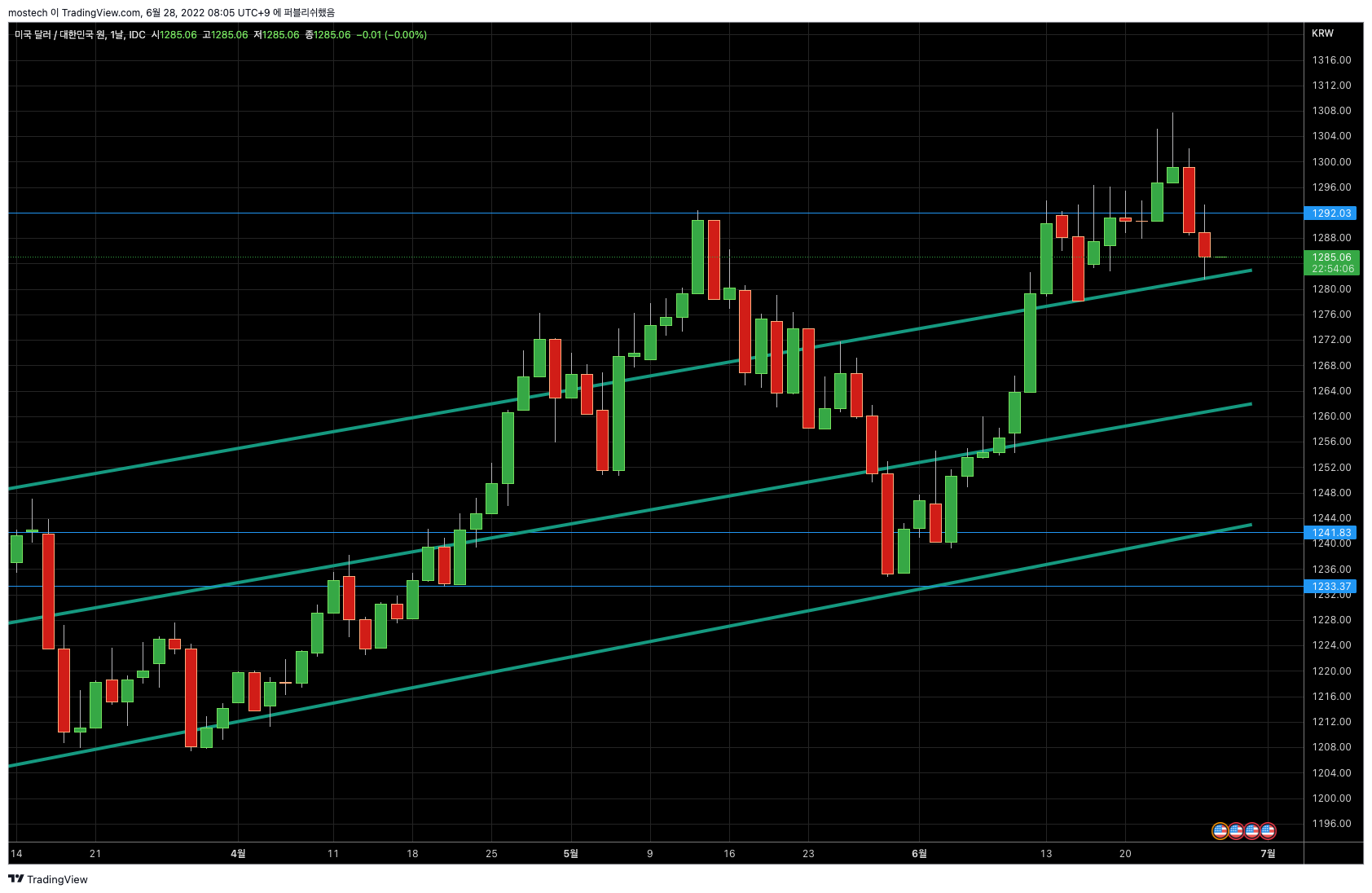 환율은 조금은 진정되고 있는 모양세 입니다. 미장이 폭락하지 않으면 조정이 계속 되면 환전 기회가 오지 않을까 합니다.