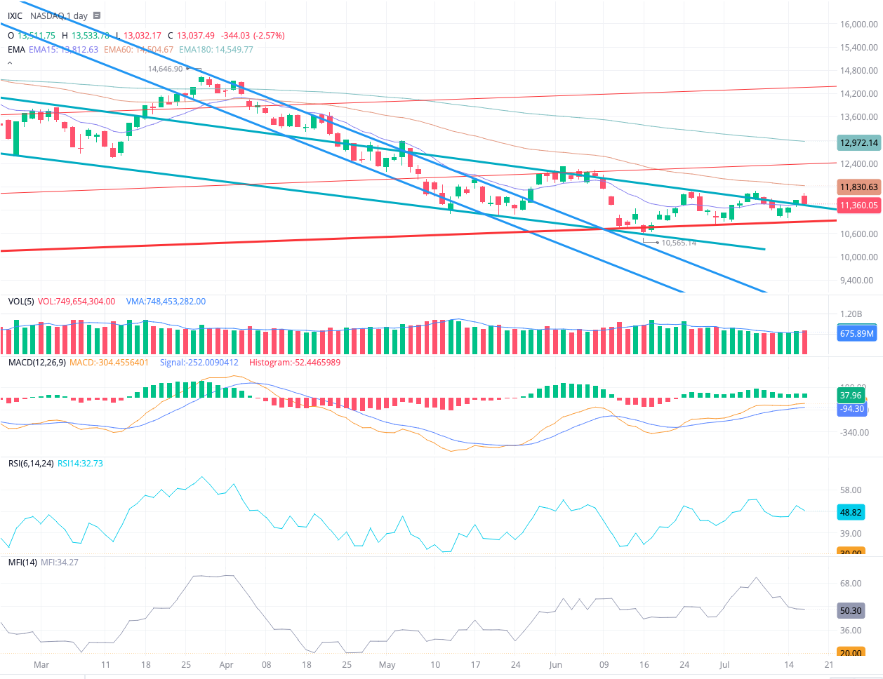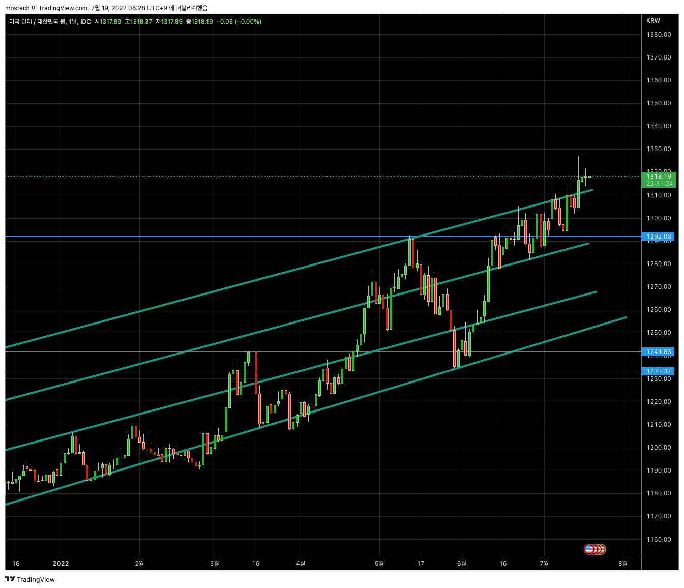 나스닥 차트를 보면 상단선을 벗어날려고 시도 하다가 떨어졌습니다. 26일에 있을 FOMC 미팅에 0.75%를 올릴지 아니면 1%를 올릴지 불확실성이 있어서 입니다.