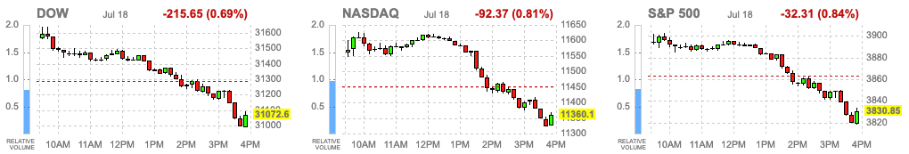 미 동부 시간 18일 뉴욕증권거래소(NYSE)에서 다우존스30산업평균지수는 전장보다 215.65포인트(0.69%) 떨어진 31,072.61로 거래를 마쳤습니다.