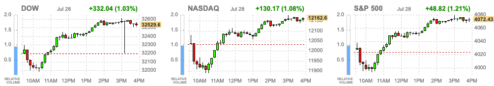 뉴욕증시는 큰 변수없이 예정된 금리인상이 발표되자 불확실성 제거를 호재삼아 큰 폭으로 올랐다 . 이날 다우존스는 1.37% 상승한 3만2197.59로 마감했다. S&P500 역시 2.62% 급등해 4023.61로 장을 마치며 4000포인트를 넘겼다. 기술주 중심의 나스닥은 4.06% 올라 1만2032.42로 마감했다. 이번주 빅테크 기업의 실적발표와 2분기 GDP 잠정치 발표 등 굵직한 대형 이벤트가 이어지는 가운데 시장 향방을 결정지을 금리인상이 시장 예상에 부합하게 이뤄지면서 한숨을 돌린 분위기다.