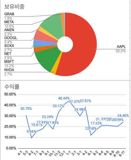 현재까지 미국주식 투자 수익율은 아래와 같습니다. 1월에 최고 40.44% 수익났었고 그 이후 하락하면서 베어마켓을 지나 오늘 24.40%까지 올라왔습니다. 올해 안에 40% 를 넘어서는 수익률이 나오지 않을까 생각합니다.
