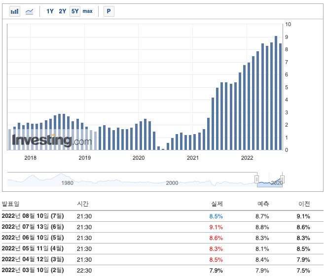 7월 CPI는 전년 동월보다 8.5% 오른 것으로 집계됐다. 이는 1981년 11월 이후 최대폭이었던 전월(9.1%)보다 상승폭이 크게 둔화한 것이다.