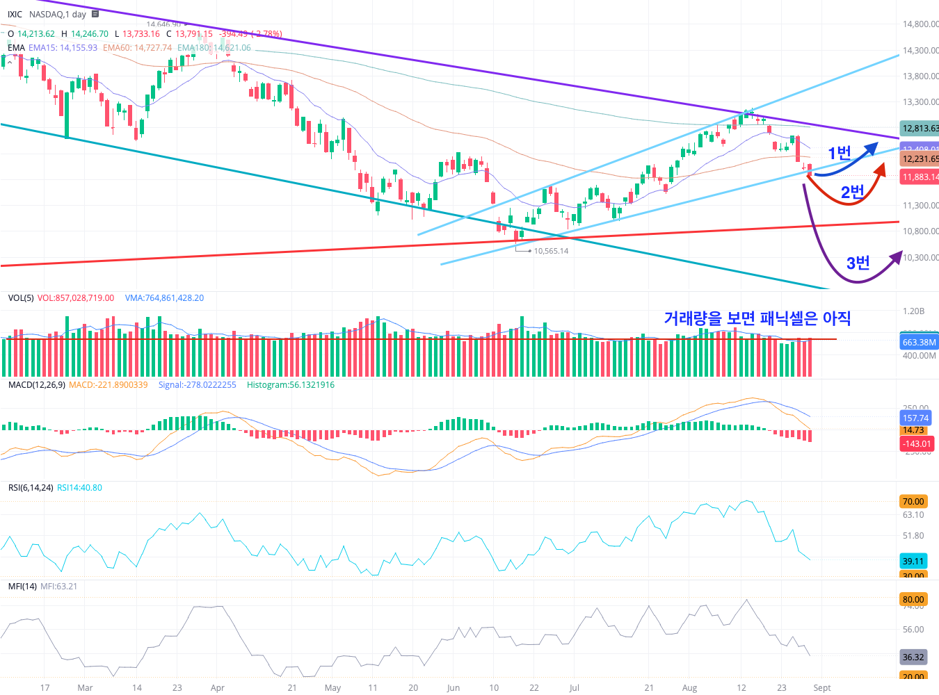나스닥은 어제도 하락하면서 필자가 그어놓은 하단선을 터치 했습니다. 오늘 시장 상황을 봐야 하겠지만 현재로선 3가지 시나리오를 가지고 접근해야 할것 같습니다.