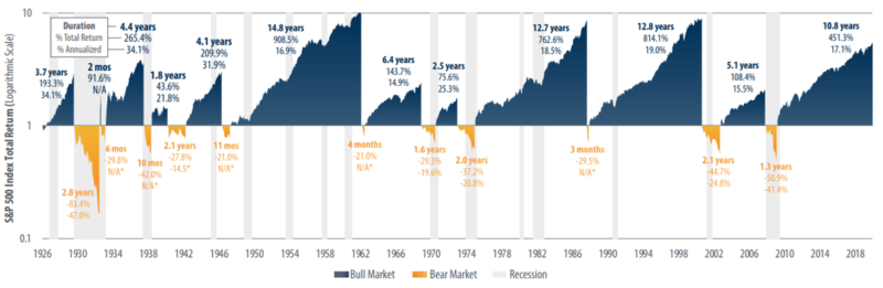 1926년부터 미국증시의 상승기와 하락기를 나타내는 차트입니다.