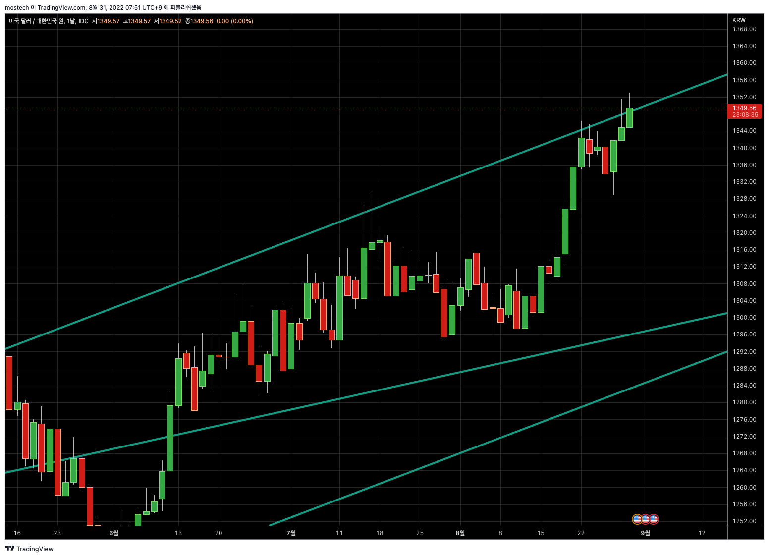 환율은 1250원을 돌파했습니다. 오늘 기술적 반등이 있다면 조금 조정을 받을 것으로 예상됩니다.