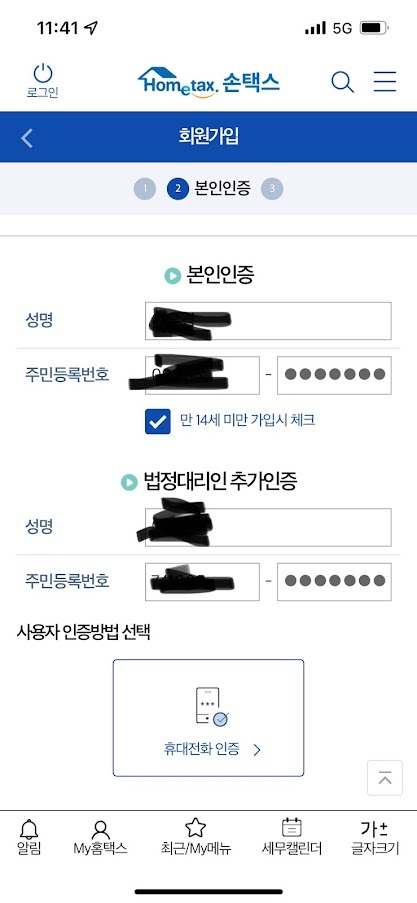 - 본인인증은 아이 이름과 주민번호를 적고 만 14세미만 체크하시고 법정대리인에 부모중 한명을 넣고 부모 휴대폰으로 인증을 받습니다.