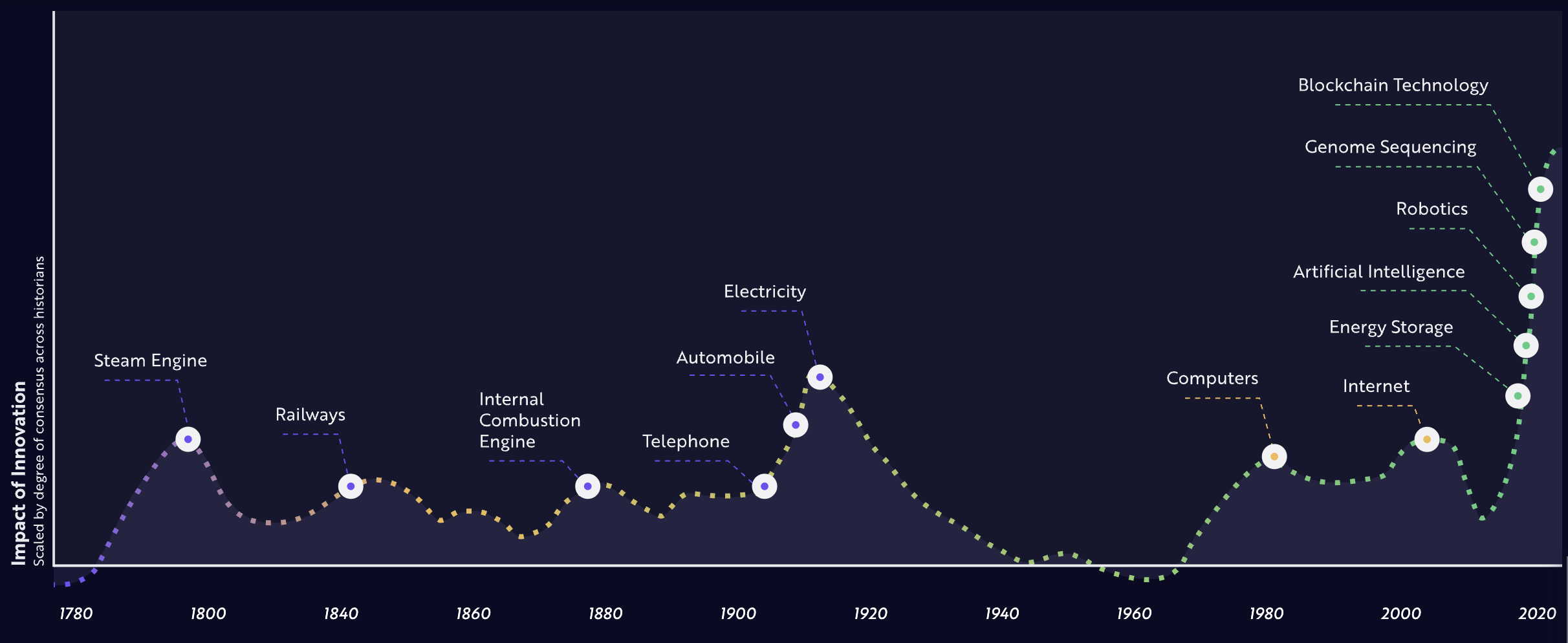 위 그래프도 보면 증기기관부터 철도, 전화, 자동차, 인터넷, 코인등 새로운 혁신이 산업을 발전시키고, 성장하게 만들어왔으니 유망한 신사업에 투자 한다는 의미이다.