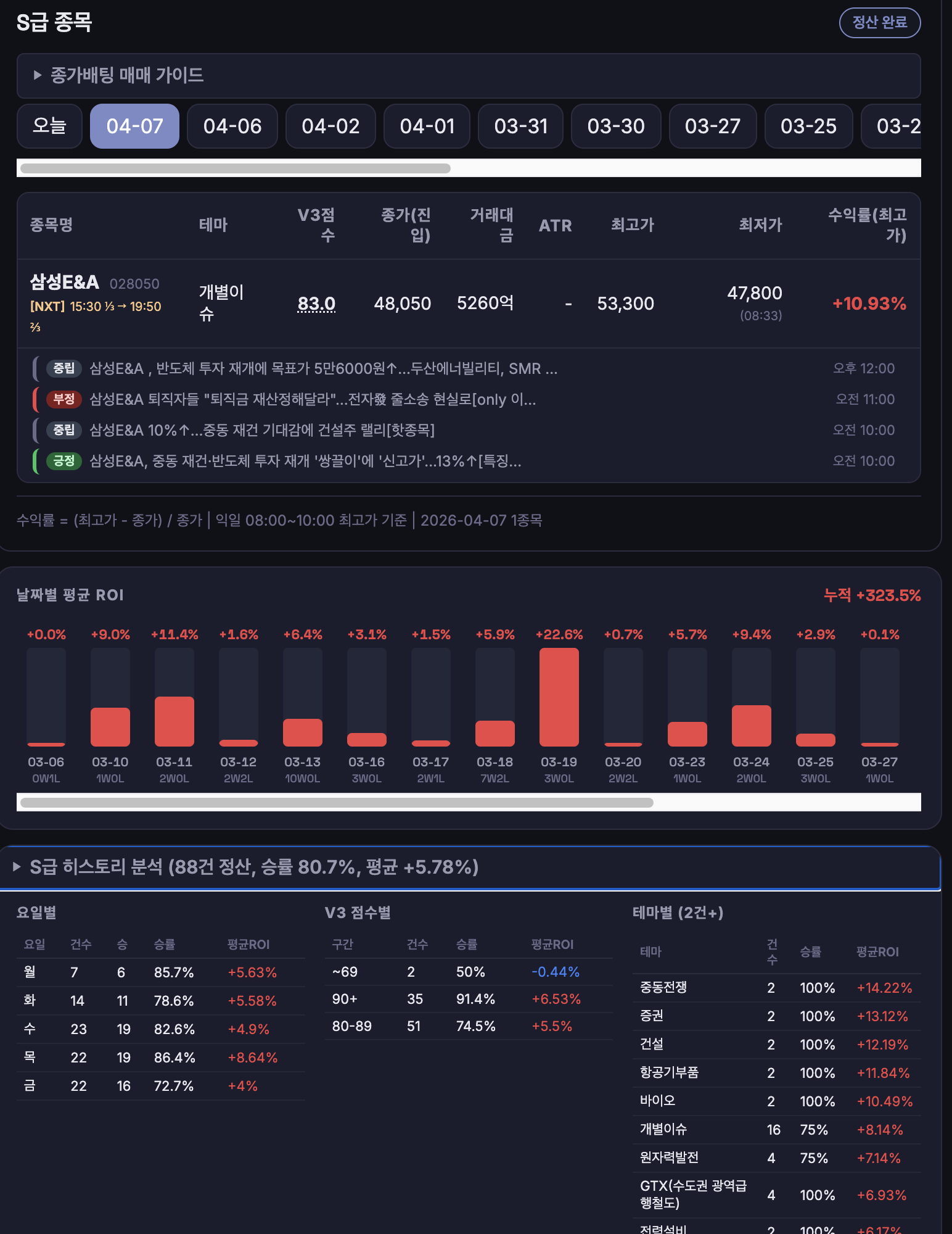 V3 스코어링이라는 점수 시스템으로 기준 이상 종목만 S급으로 선정해요.