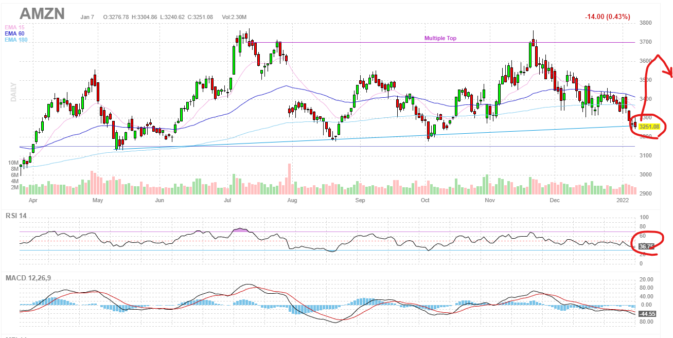 현재 직전 저점 보다 내려와있는 상태입니다. Finviz 슈퍼컴퓨터가 그림을 그려놨는데 하단 파란선에 물려 있네요. 또한 RSI가 작년 10월 저점에 내려와 있습니다. EMA 60일선 밑 매수 추천!