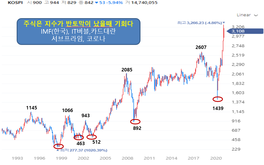 위 그래프는 1990년부터 2020년 초반까지 코스피 차트 이다.
