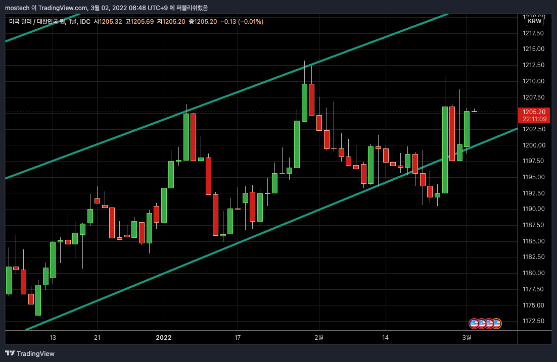 환율은 하단 채널기준으로 널뛰기 중이네요. 하락시에 분할로 달러 매집 하시길 바랍니다. 기준가격은 1197원 수준입니다.