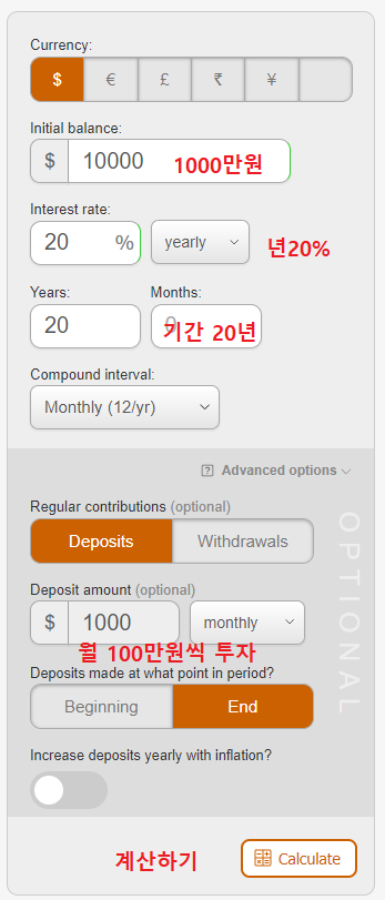 영어로 나와서 당황 되겠지만 국내 사이트에서 복리계산기를 제대로 만든 사람이 아직 못 찾아서 외국사이트를 사용했다.(혹시 괜찮은 곳 있으면 답글로 알려주기 바랍니다)