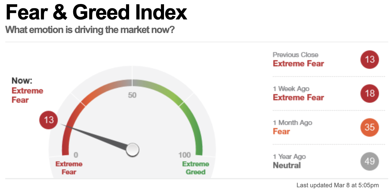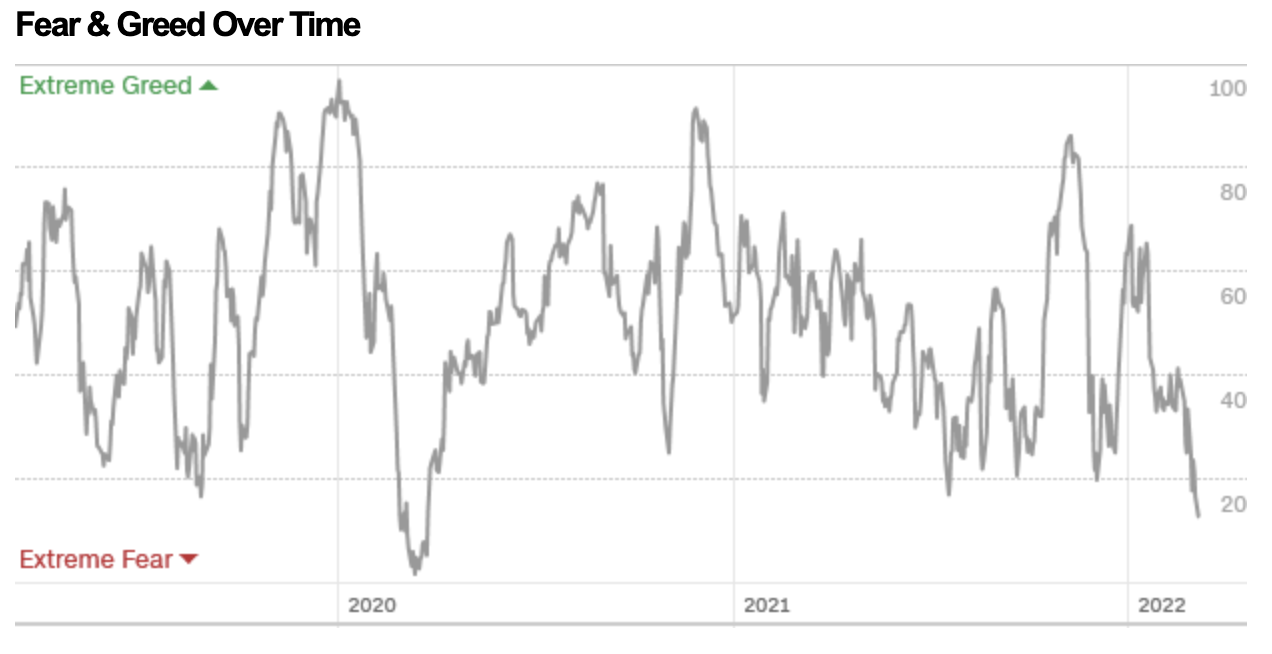현재 CNN의 공포지수는 13 으로 시장의 공포상태 입니다. CNN F&G지수의 월간 그래프를 보면 현재 코로나 팬더믹 시작을 제외한 최저를 기록하고 있습니다.
