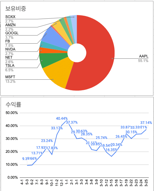 현재 수익률은 연초 수준인 40%까지 약 3%정도 남고 거의 다왔습니다. 앞으로도 폭락시 꾸준히 대형 우량주에 투자했으면 편하게 두면 알아서 올라갑니다.
