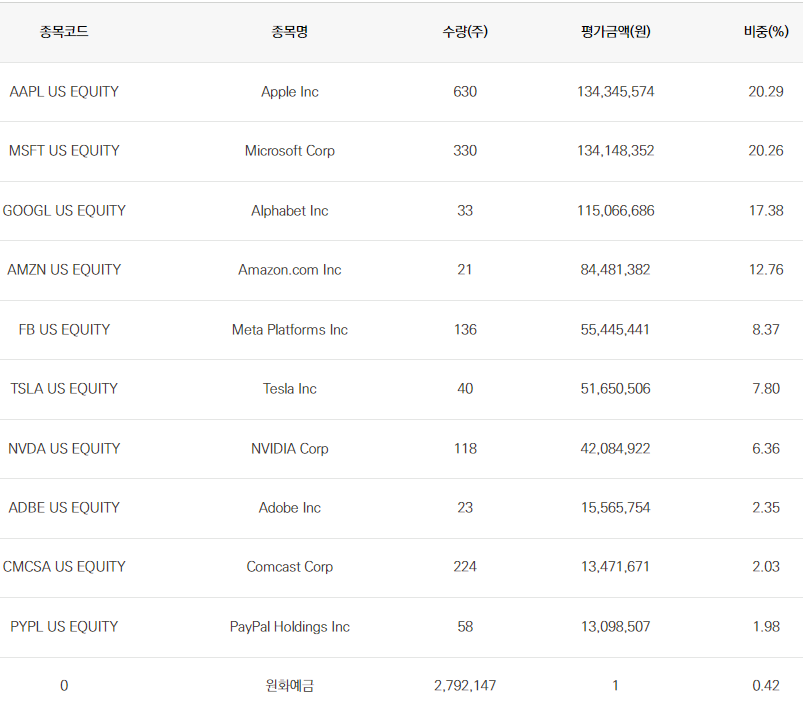 우리가 아는 미국테크 대형주에 고르게 투자되고 있다.