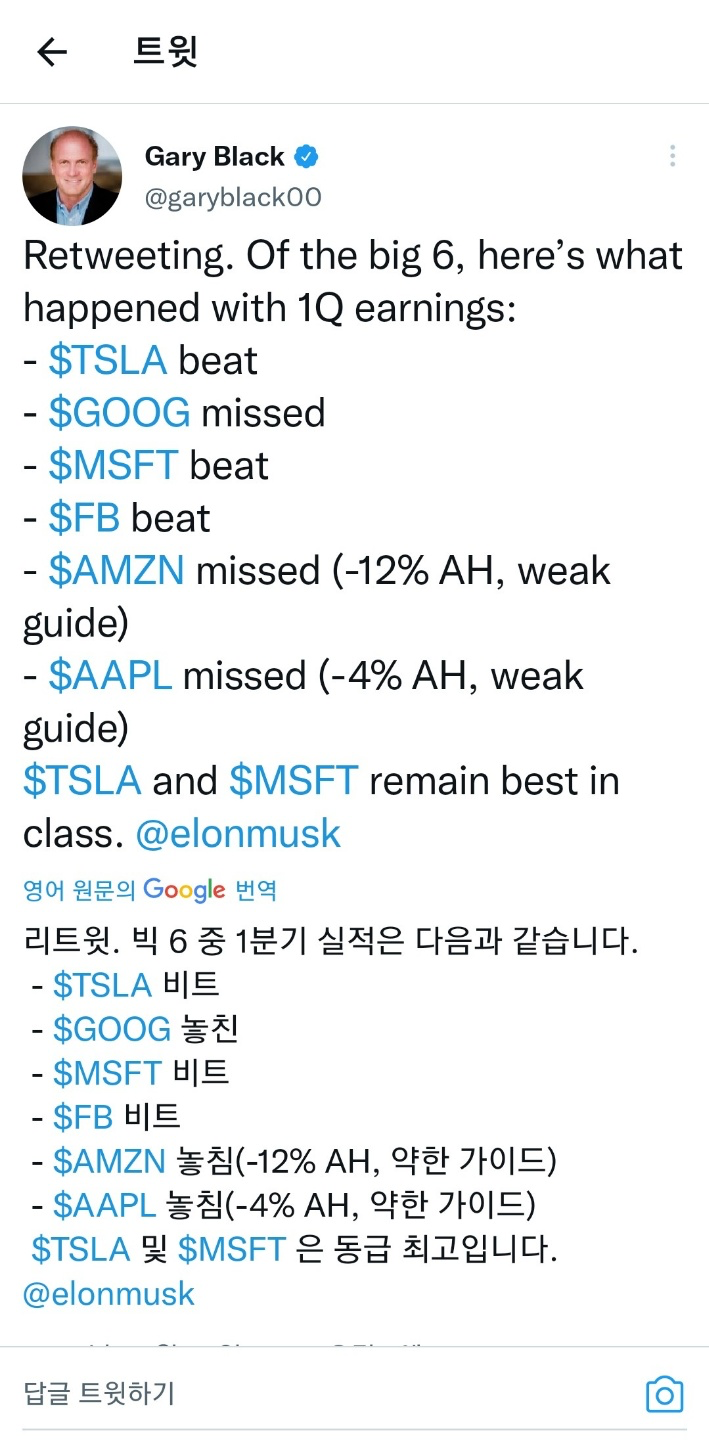 우리의 주요 투자처중에 원픽인 애플은 어닝서프라이즈가 나왔습니다. 2분기 전망(컨센서스)가 애플에서 발표되지는 않았지만 시장에서 전쟁과 중국의 락다운으로 감소할 것이라는 예측으로 애프터장에서 다시 조정을 받고 있습니다. 지난번에도 블로그에 적었지만 실적이 SO~SO~ 할것이란 필자의 개인적 예측이 맞지 않았나 싶습니다.