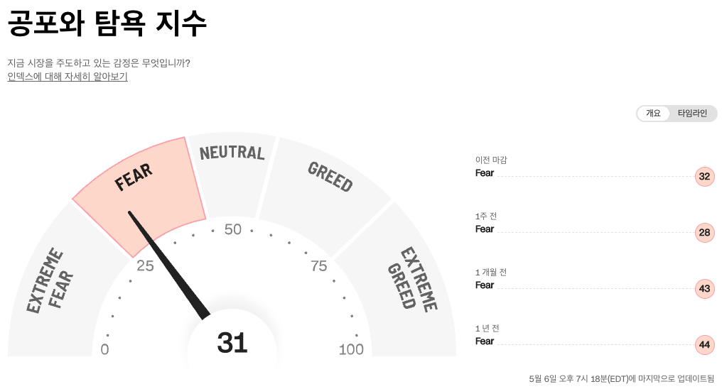 투자자들이 현재 공포단계인데 바닥의 신호는 일반적으로 극도의공포(Extreme Fear)가 되어야 반등을 해왔다는것을 인지하면 여전히 투자자들은 언제든지 주식을 매수 할 현금을 손에 쥐고 있다는 뜻입니다.