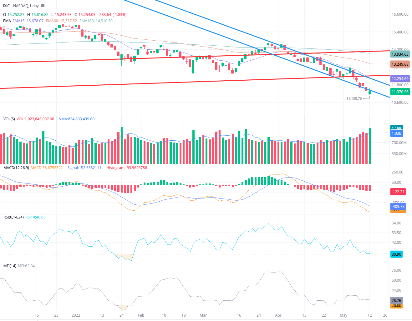 나스닥은 보합수준으로 마쳤지만 어제는 장중 하락으로 저가 매수세가 많이 들어온것을 거래량을 보면 알 수 있습니다. 위에 올린 애플또한 RSI가 코로나로 최저점일때 RSI 수준까지 내려왔고 애플이 140달러면 저렴하지 않을까요?